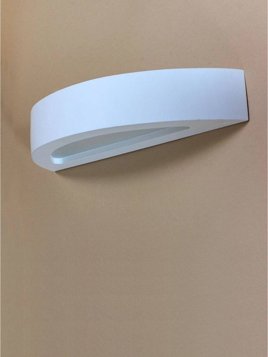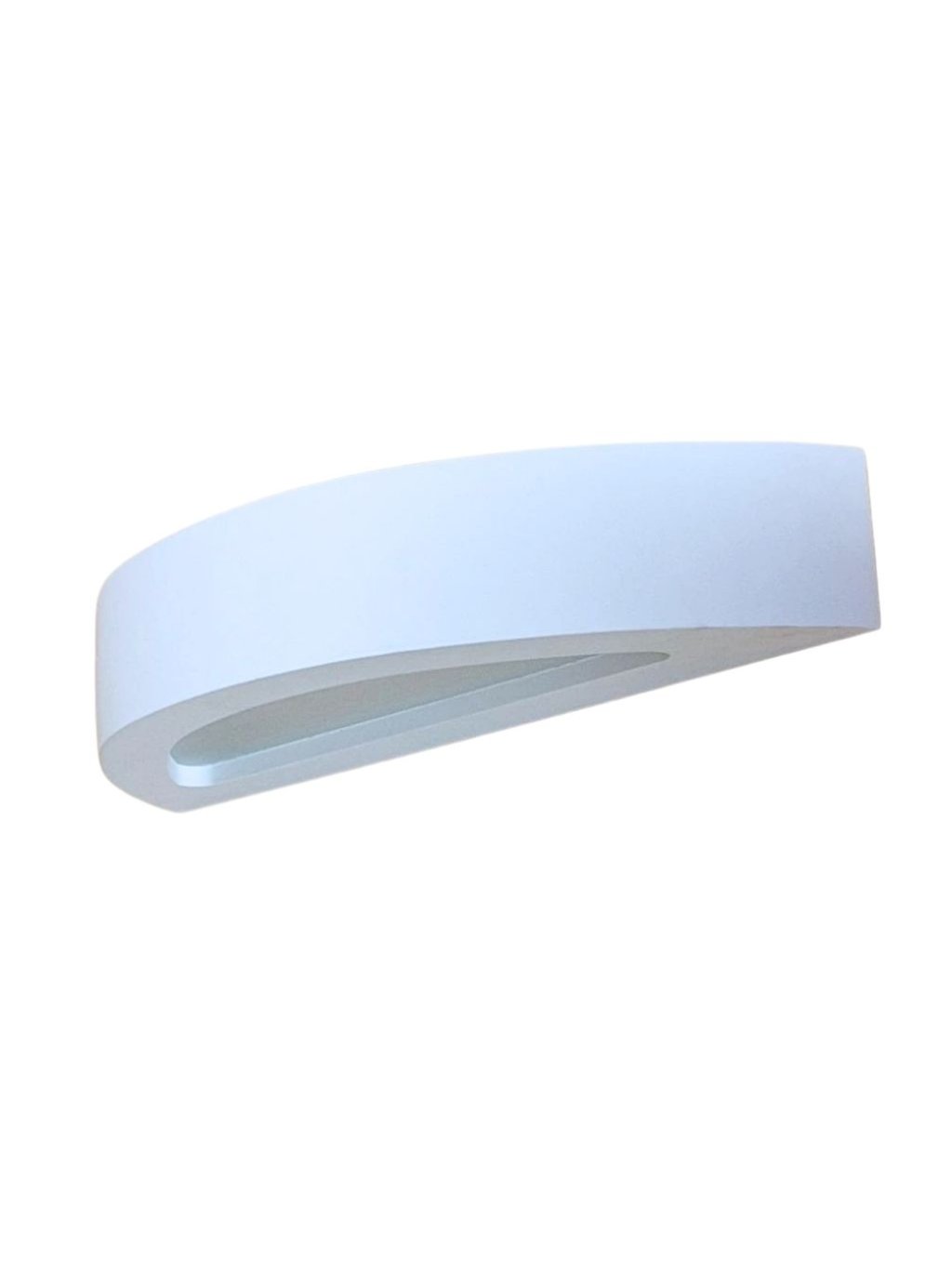 Svítidlo ze sádry na zeď. Má tvar půlkruhu, bude svítit nahoru a dolů. Ve spodní části je sklo a v horní je položený akrylový profil jako kryt, skrz něj právě světlo svítí také. Obě objímky směřují z rohů do středu svítidla. Patice pro zdroj 2xE14 na max. 13W typu LED. Délka 42cm, výška 7cm a od stěny 15cm.